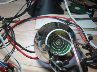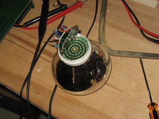 | displayed the device innards. 3 wires from the power supply attach to the circuit board. The LEDs are mounted on the circuit board in sets of 8 or 10, with traces connecting the banks of LEDs that are wired in series. |