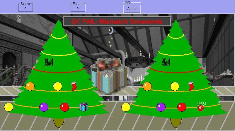 |   | What it isqctreeis a kid-safe game for 2011.As Christmas approaches, Quality Control at the North Pole goes downhill. Everyone is just trying to get things out the door as fast as they can, regardless of quality. The Big C isn't so thrilled with this lack of quality. It's his brand, after all. So, you've been hired to check the Christmas Trees and confirm that they are identical.